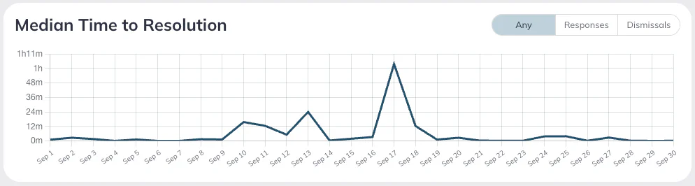 The Median Time to Resolution chart shows the median time to resolution, broken down by day within your selected time frame. You can view different variations of this chart by selecting the ‘Responses’ or ‘Dismissals’ tab.