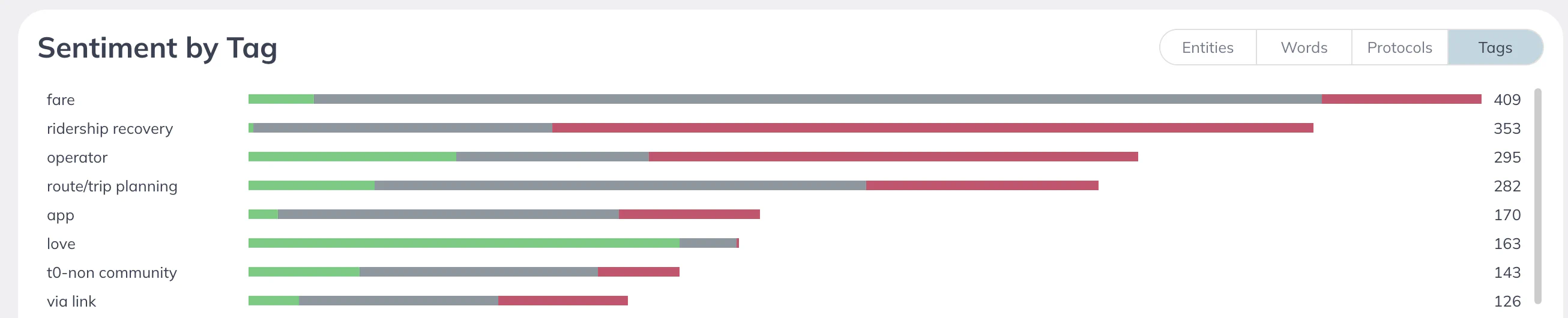 By hovering over any of the bars in the charts, you can view the actual totals for each sentiment within the selected category (protocol, tag, or word). Additionally, the far right side of the bar charts displays the total volume for each row of your chart.